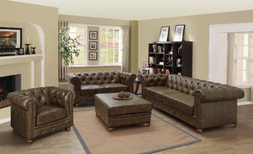 #Winston Vintage 4-Pc Leather Sofa Set by Armen Living The Classic Chesterfield is a staple in every room requiring refinement and elegance. The aesthetically pleasing antique bonded leather cover offers years of low-maintenance, while the antique nails accentuate the quality of each piece. Richly appoint your living space with this luxurious living room sofa set. This Set includes 1 Sofa, 1 Loveseat, 1 Arm Chair, and 1 Ottoman. Features: Vintage Style Button Tufted Rich, Bold Detail Antique Nailhead Accents Luxurious Tobacco Brown Rich Bonded Leather Upholstery Maple Finished Round Bun Feet Ottoman Not Included Assembly Required Ships Via Freight Dimensions: Sofa Size - 80" W x 30" D x 38" H Loveseat Size - 65" W x 30" D x 38" H Armchair Size - 41" W x 30" D x 38" H Ottoman Size - 41" W x 30" D x 18" H Weight: Total - 435 Lbs. Sofa - 153 Lbs. Loveseat - 130 Lbs. Armchair - 95 Lbs. Ottoman - 57 Lbs.