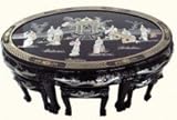 | ✚✚✚ Oriental Tea Table, Inlaid Pearl, Six Stools & Glass Top This beautiful Oriental tea table set offers seating and other uses in a compact style. Use the 6 stools as another table, stool or end table! Top is covered with a glass top and makes a tea ceremony or snack a pleasure. Use as a coffee table , made of Solid Philippine Mahogany and finished in shiny black Chinese lacquer with hand carved mother of pearl palace design . Make a elegant statement in any contemporary, traditional or Asian interior. Measures 48 by 30 by 18 inches high.
