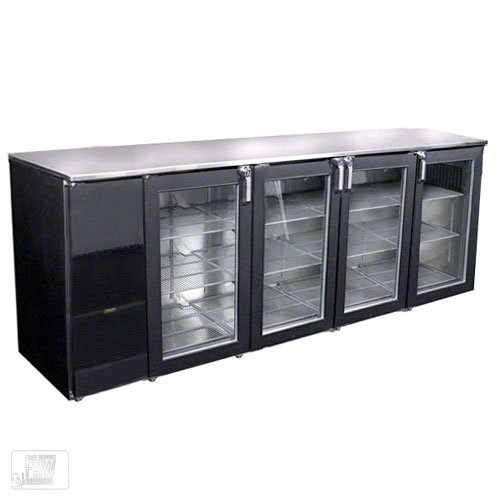 Glastender ND92-L1-GS(LLRR) 92" Glass Door Back Bar Cooler?Even in large, high-volume commercial foodservice operations space behind the bar can be limited. Stock plenty of canned and bottled beverages while also saving valuable floor space with a narrow door back bar cooler. The 92" Glass Door Back Bar Cooler from Glastender (ND92-L1-GS(LLRR)) offers maximum storage space for canned and bottled beverages; in fact it can hold over 25 cases of 12 ounce beer bottles or 264 wine bottles (750ml). The glass doors allow customers to view the selection before ordering, speeding up service, and the stainless steel top ensures that this model can handle the tough conditions of commercial bar environments. Keep the beverages cold and the profits flowing with this self-contained back bar cooler featuring space-saving narrow doors. Features: Stainless steel die-cast handles, Self-contained back bar cooler, 1/2" thick ABS plastic threshold, CFC free foamed-in-place insulation, Automatic condensate evaporator and defrost timer, Stainless steel top with black vinyl-clad steel exterior front and sides, Left door hinged left, left-center door hinged left, right-center door hinged right and right door hinged right . Benefits: Leg sockets recessed into base for improved durability, 180° swinging narrow doors for improved access in tight spaces , Six foot grounded cord and plug exits at rear for effortless installation, Stainless steel adjustable bullet feet ensure level installation on uneven floors, Stainless steel interior construction with radius interior corners for easy cleaning.