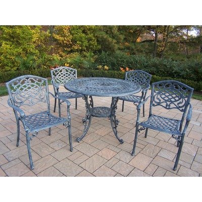 #2011-2120-5-VG Features: -Material: Rust free cast aluminum.-Combines southern style and modern designs giving you a rich addition.-Traditional lattice pattern and scroll work is crisp and stylish.-Prefect piece for any outdoor dinner setting.-Just the right size for any backyard or patio.-Fade, chip and crack resistant. Includes: -Set includes One table and four dining chairs. Color/Finish: -Hand cast and finished for the highest quality possible.-Hardened powder coat finish in verdi grey for years of beauty. Assembly Instructions: -Stainless steel or brass assembly hardware.-Some assembly required. Dimensions: -Table dimensions: 29'' H x 42'' W x 42'' D.