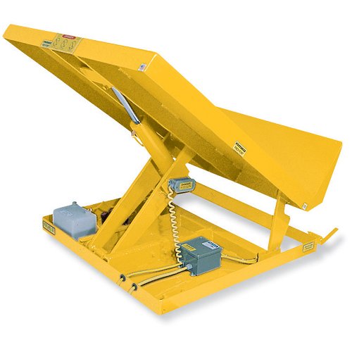#Can lift and tilt at the same time (using the hand control) or fully tilt and then lift (with the mechanical foot pedal). VESTIL UniTilt Lift/Tilt Table is ideal for manufacturing operations to position products for welding or fitting of internal components, or loading raw materials onto finishing machinery. 40° tilt angle. Smooth platform features a 12"H lip that supports containers during operation. 24V AC hand control with 8' cord. Welded steel construction. Also includes adjustable upward travel limit switch and straight toe guards. Color: yellow. Appropriate for lean manufacturing.