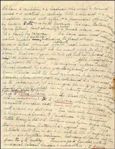 ROSITA FORBES - AUTOGRAPH LETTER SIGNED 01/27/1925?ROSITA FORBES. Remarkable, detailed account of her travels in Ethiopia. Autograph Letter signed: "Rosita Forbes", 2p, 6¾x9. In camp in the Tchercher Mountains, 1925 January 27. To agent James B. Pond. Some place names underlined in red pcncil. In full: "My Abyssinian Venture is going excellently. As I hoped the cinematographer & I have arrived at the psychological moment when Ras Tafari, having visited Europe, is anxious for publicity & desirous of showing his country at its best. He sent us a warm message of welcome to Harrar & a promise to facilitate our journey in every possible way, so our 1800 mile route has now been decided. We left Dire Dawa on Jan. 16 & 2 days across mountains took us to Harrar, a medieval walled town where we saw the great ceremony of Epiphany - the blessing of the water (a mountain pool) by priests in the most gorgeous vestments under gold, purple & red velvet umbrellas & the rush of thousands of men, all in white, rifles or spears on their backs, to throw themselves into the holy water. There the procession of the Arks containing copies of the Tablets of Moses, with indescribably magnificent entourage. There the dance of the Priests before the Ark, as David danced before Ark of Covenant. We are now on our way through wild mountain country, by lake, forest & river to Aukober & the capital, Addis Abeba. We have a caravan of 12 baggage mules, 4 saddle ones & 2 special mules, the gift of the Harrar Governor, with silver harness & trappings of purple velvet embroidered in every colour. We have 6 muleteers, & a headman who wears a curved sword & is swathed in cartridge belts, 2 servants & a guide, 10 soldiers armed with rifles, & a provincial official, an honor done us by the Governor. This man, Ballambarassi Gabra Selessi, has 3 servants, 4 mules, & a female slave, so you see it's a fairly big caravan. We have seen most interesting... For more information contact HistoryForSale. DOCUMENT 266538